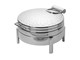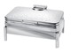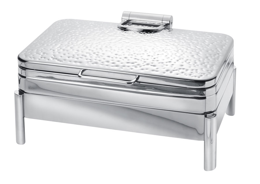 Our most popular chafing dish now offered with a hinged lid and induction capability. Eastern’s Park Ave rectangular chafing dish will elevate your entertaining to a new level. Its elegant dome cover provides a high profile look and stops at any angle for safety purposes. Designed in heavy duty stainless steel, one piece constructed. Convenient shelf to place a gel sterno. Perfect weight for easy transport. Pan is removable for induction usage. Available in square, round and rectangular with a variety of legs.