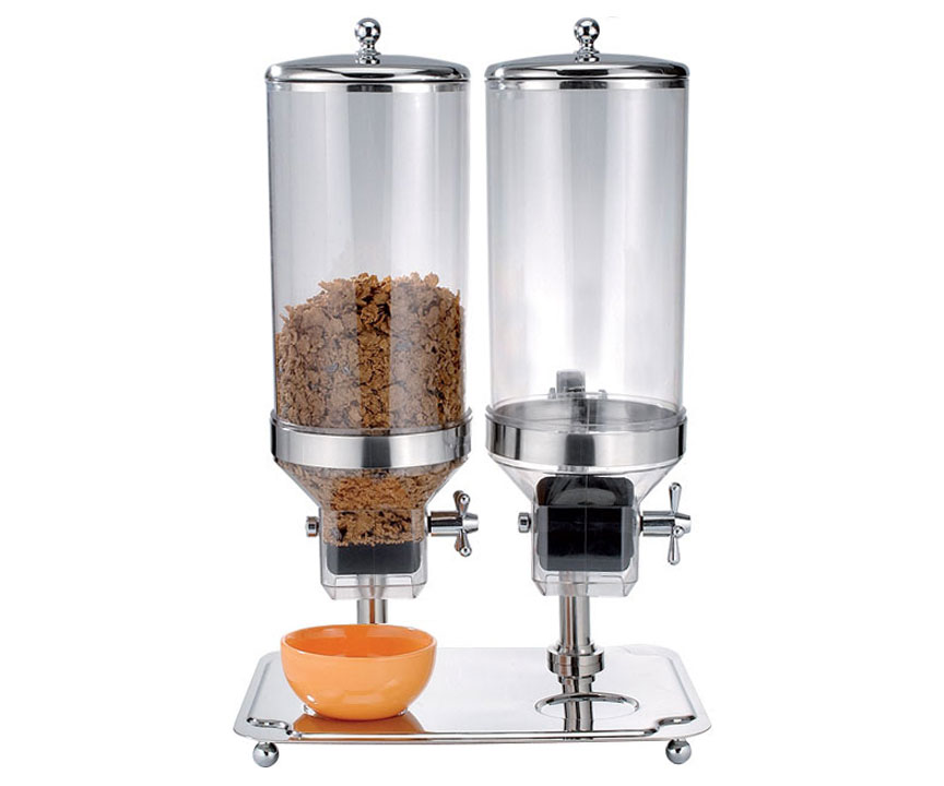 An innovative fashion in cereal dispensing – a breakthrough in breakfast buffet. Durable solid legs and a welded construction provide added support for frequent use, while the clear container gives you a perfect view of what's inside. Double cereal dispenser is a versatile option for simultaneously holding and dispensing two popular cereals, candies, or other small food.
