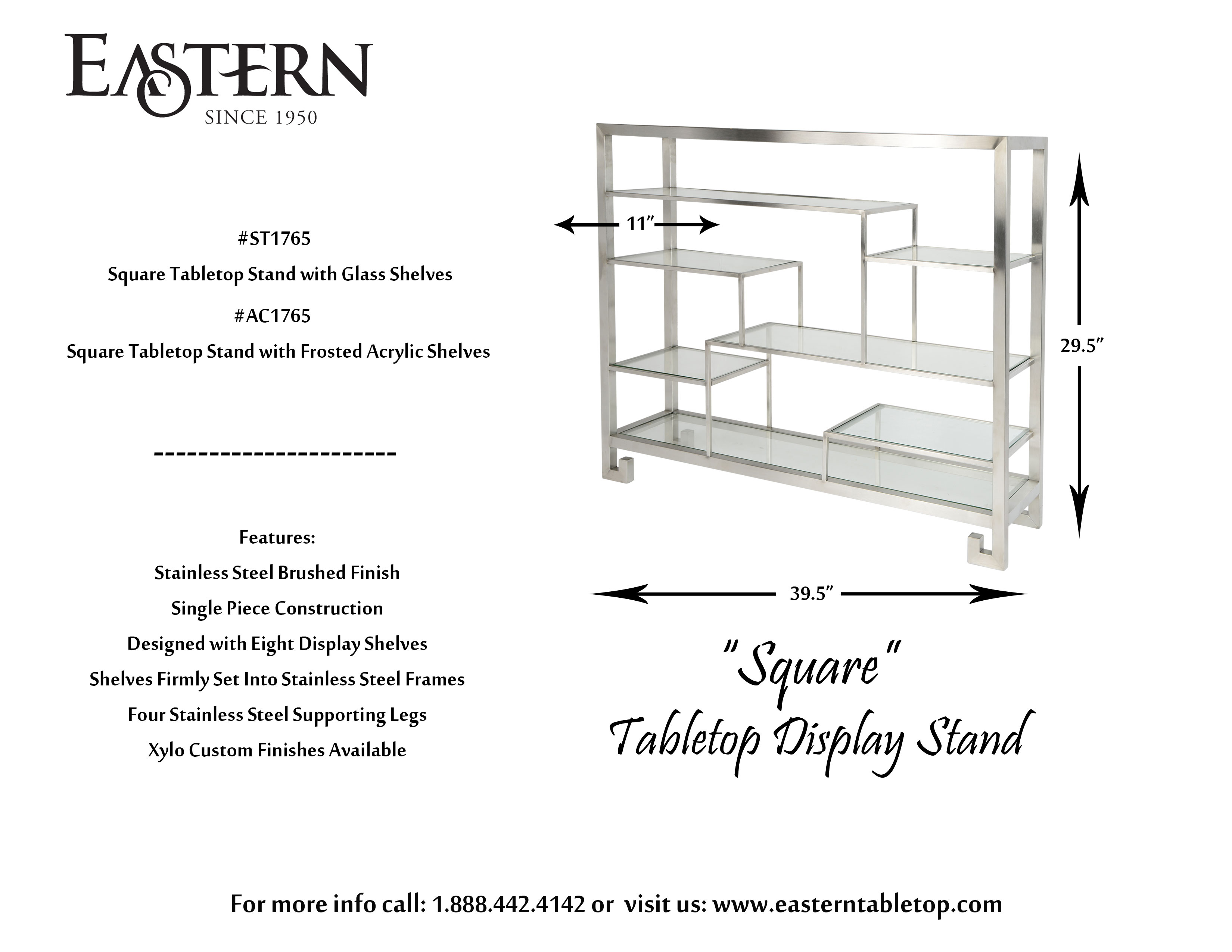 When tabletop space is limited, take advantage of the height and multi-level display with Eastern’s Square Tabeltop Stand. Double sided accessible with eight shelf display offers plenty of tray space. Capable of turning any venue party ready within seconds, our Square Tabletop Stand is lightweight and easy to carry around with a weight of 25 lbs. and requires no assembly making it the perfect platform for every occasion. Whatever the affair, whatever the number of people- choose the Square Tabletop Stand for a modern high class look that’s ready for anything.