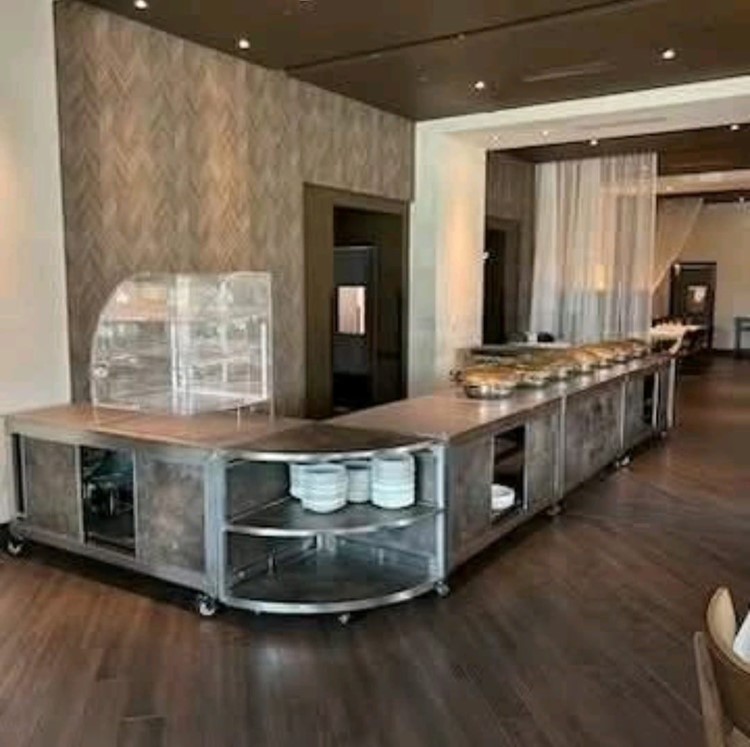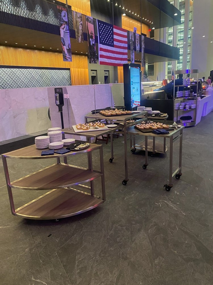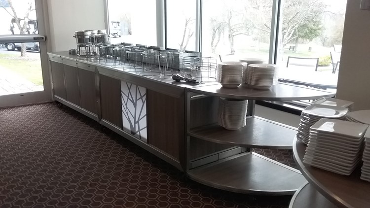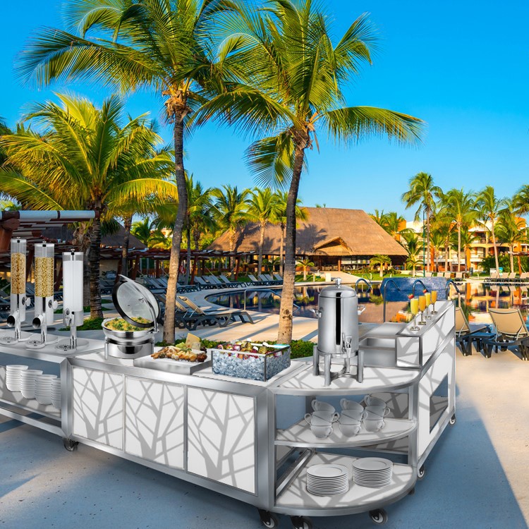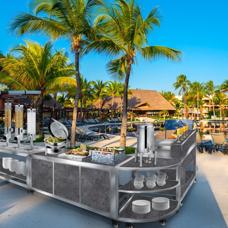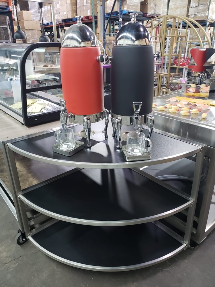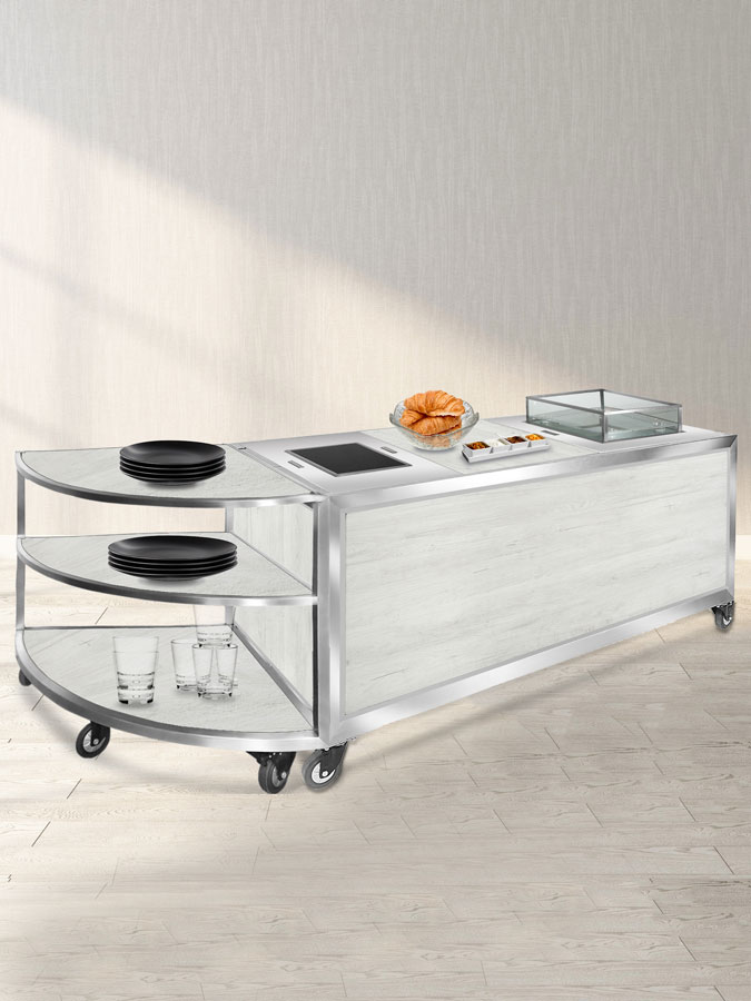 Combine a self-standing station to form a full-fledged buffet. Add the smooth, rounded corner table to seamlessly integrate multiple stations for a modern and sophisticated setup.