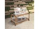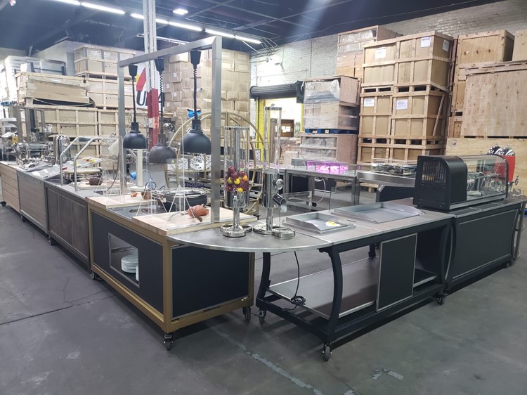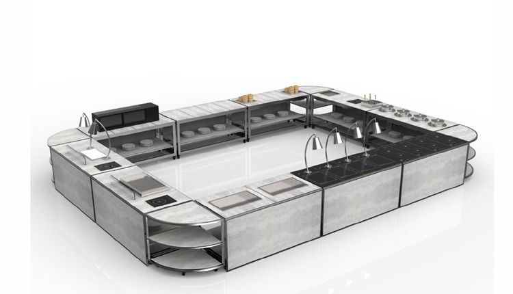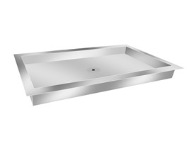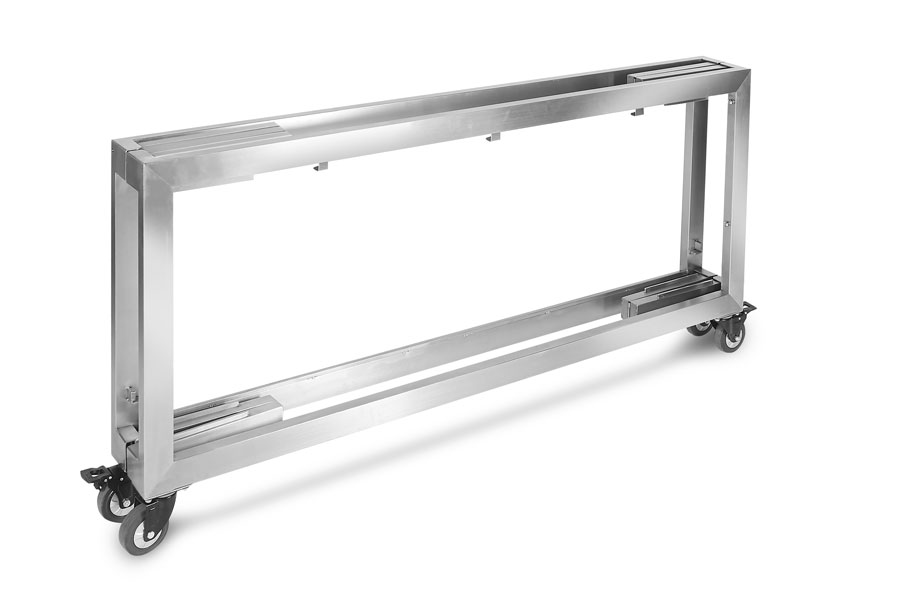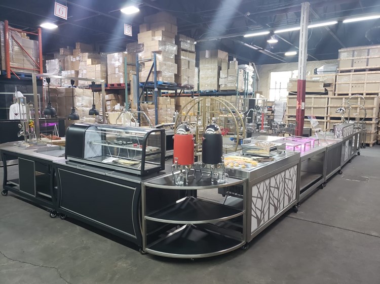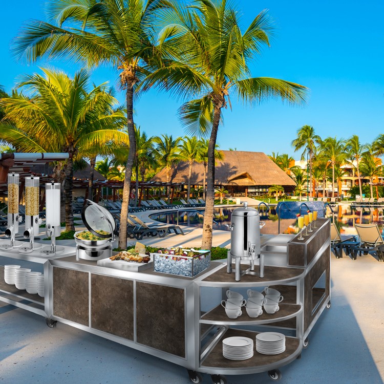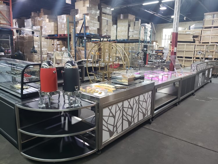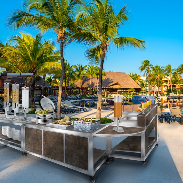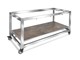 Hub Buffet Raw Bar, 66" x 30-3/4" x 32-1/4”H overall, double wall insulated 4.5" deep tabletop with drain, heavy duty, 63-1/4" x 28-1/8" reversible black/sandstone textured laminate shelf with stainless steel edge, 18/10 stainless steel frame is collapsible to 7", (4) 5" dia. swivel casters (2 with brakes)