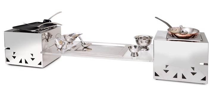 Discover the Buffet Zone....Upper level to slide in butane stove and lower level to keep your utensils at function. Lower shelf ideal for LED portable lighting that will show through the laser cut design and light up your buffet. Cut outs at each corner to interconnect harmoniously with the “L” & “X” LeXus Risers for an impressive Multi-Tiered Cooking & Food Display. It can be configured continuously in a bridge fashion for ease of on-site cooking and warming.