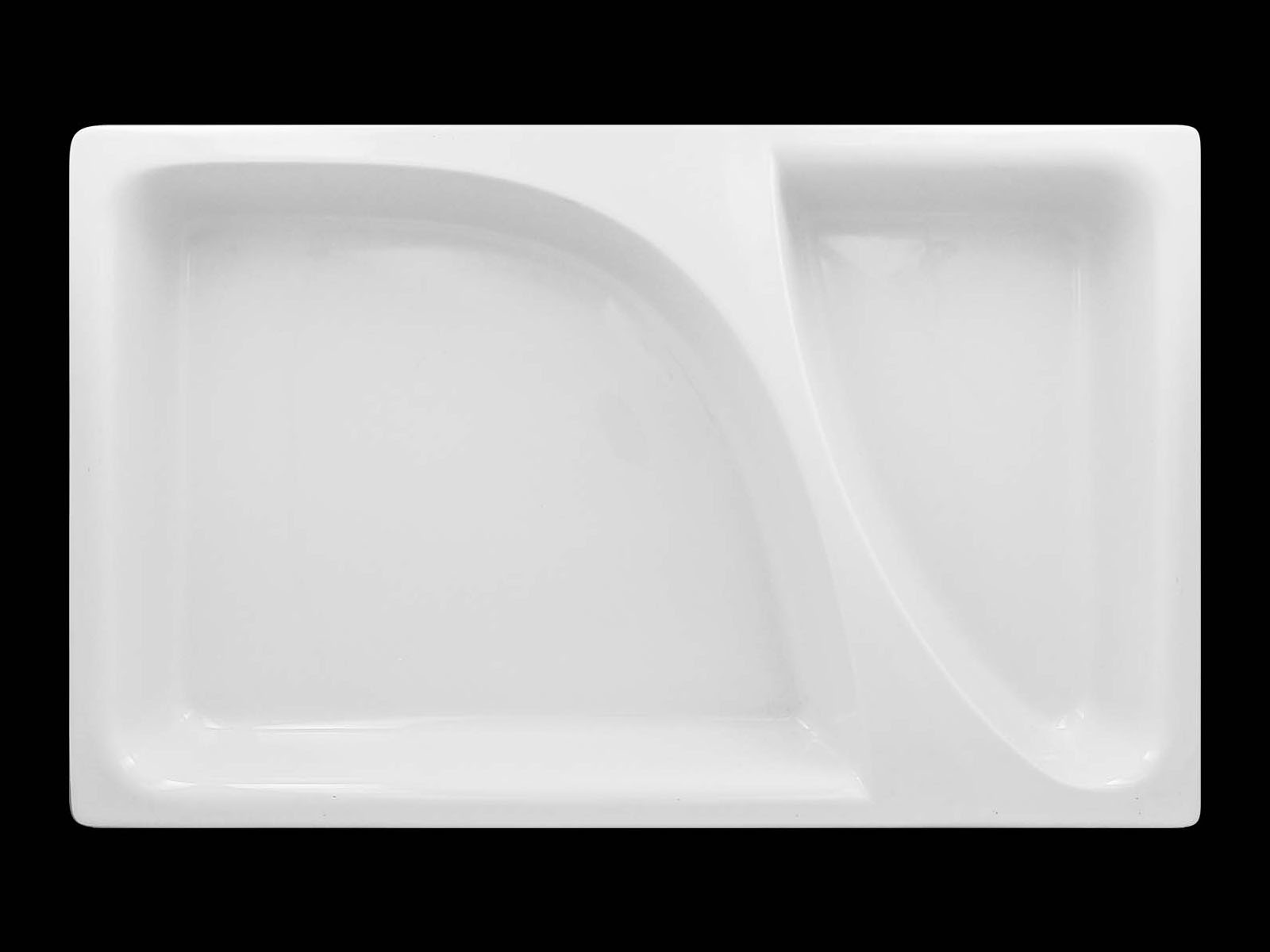 Split Dish #EB15401 has two parts so that different types of food can be displayed together. Large side has a capacity of 145 fl oz. Smaller side is 59 fl oz.