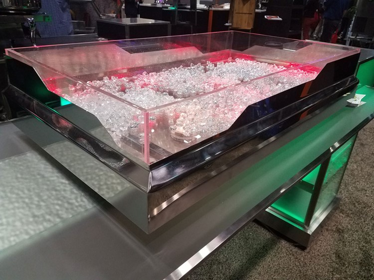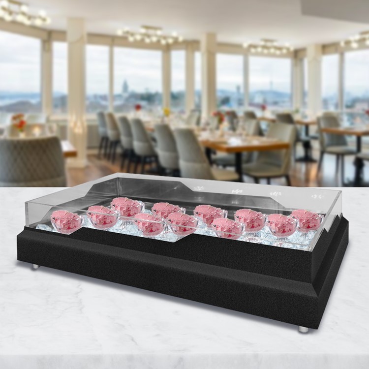 New - Upgrade your buffet presentation by replacing your plastic model with an elegant display setting. Ideal for high-end catered events featuring Lobster, Oysters and Sushi on your menu. It is manufactured in an extra heavy gauge 18/10 stainless steel featuring outer wave design and equipped with a drain hole and hose. Includes acrylic insert container with perforated holes for water drainage. In addition to its raw bar usage, the sturdy built bar has many functions and could be utilized on breakfast buffets housing cold beverages and yogurts. Eastern can custom built to fit your specifications.