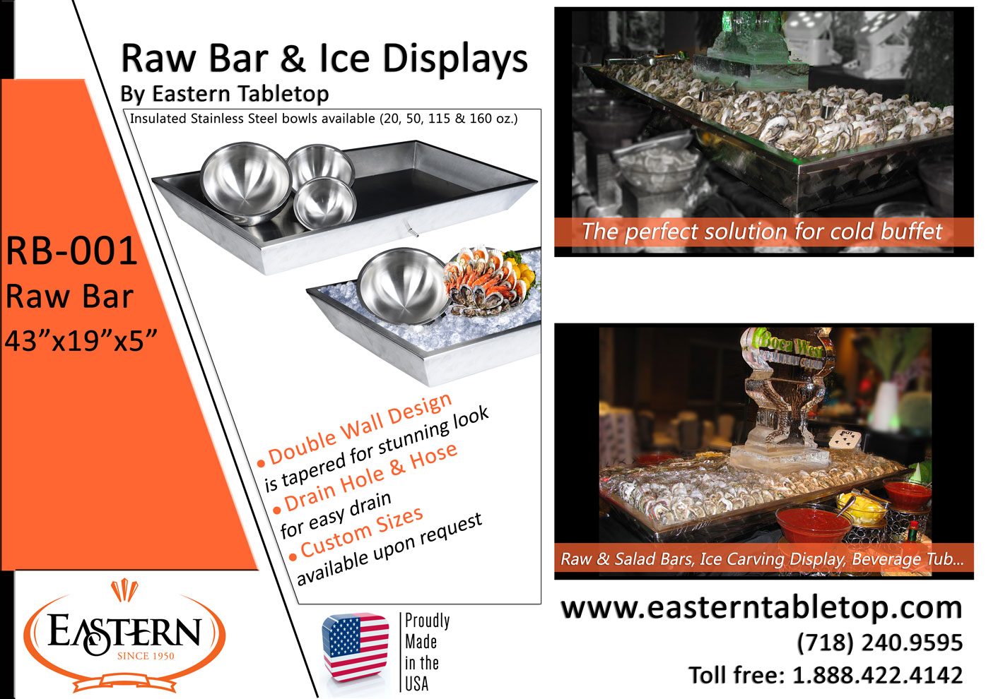 New - Upgrade your buffet presentation by replacing your plastic model with an elegant display setting. Ideal for high-end catered events featuring Lobster, Oysters and Sushi on your menu. It is manufactured in an extra heavy gauge 18/10 stainless steel featuring attractive brushed design equipped with a drain hole and hose. In addition to its raw bar usage, the sturdy built bar has many functions and could be utilized on breakfast buffets housing cold beverages and yogurts. Eastern can custom built to fit your specifications.