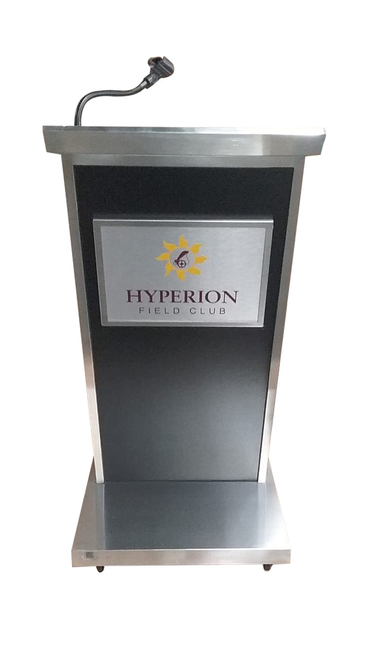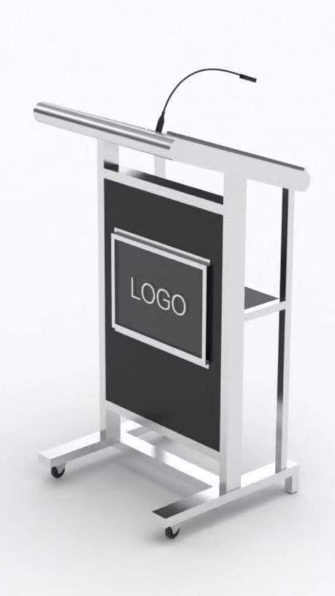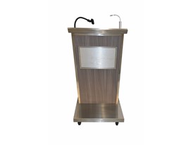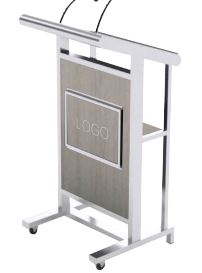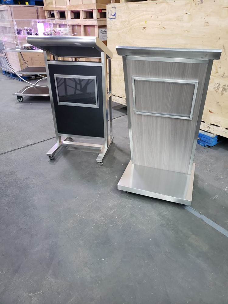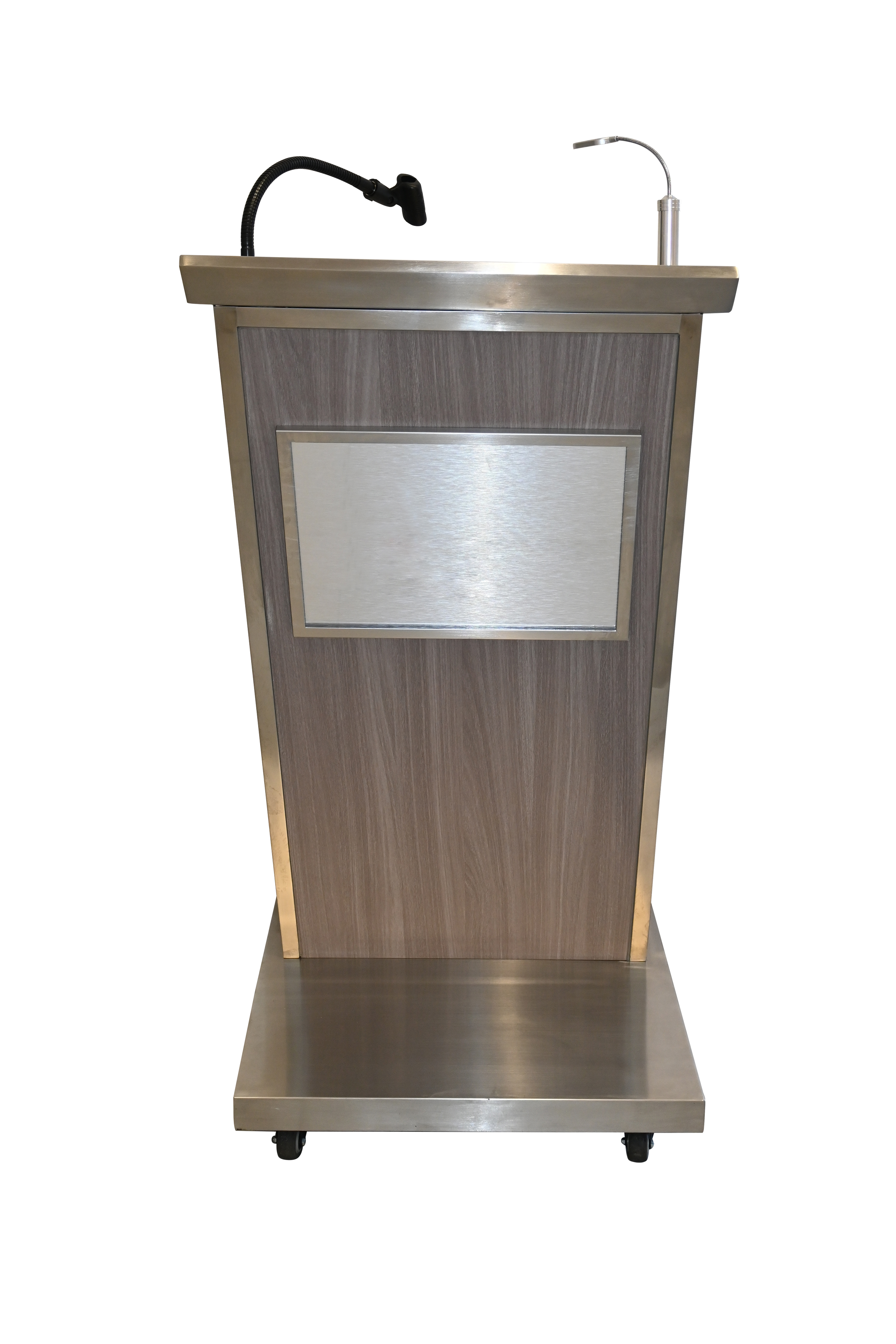 Contemporary Brushed Stainless Steel podium with HPL Grey Grained finish. Small Locking Casters.