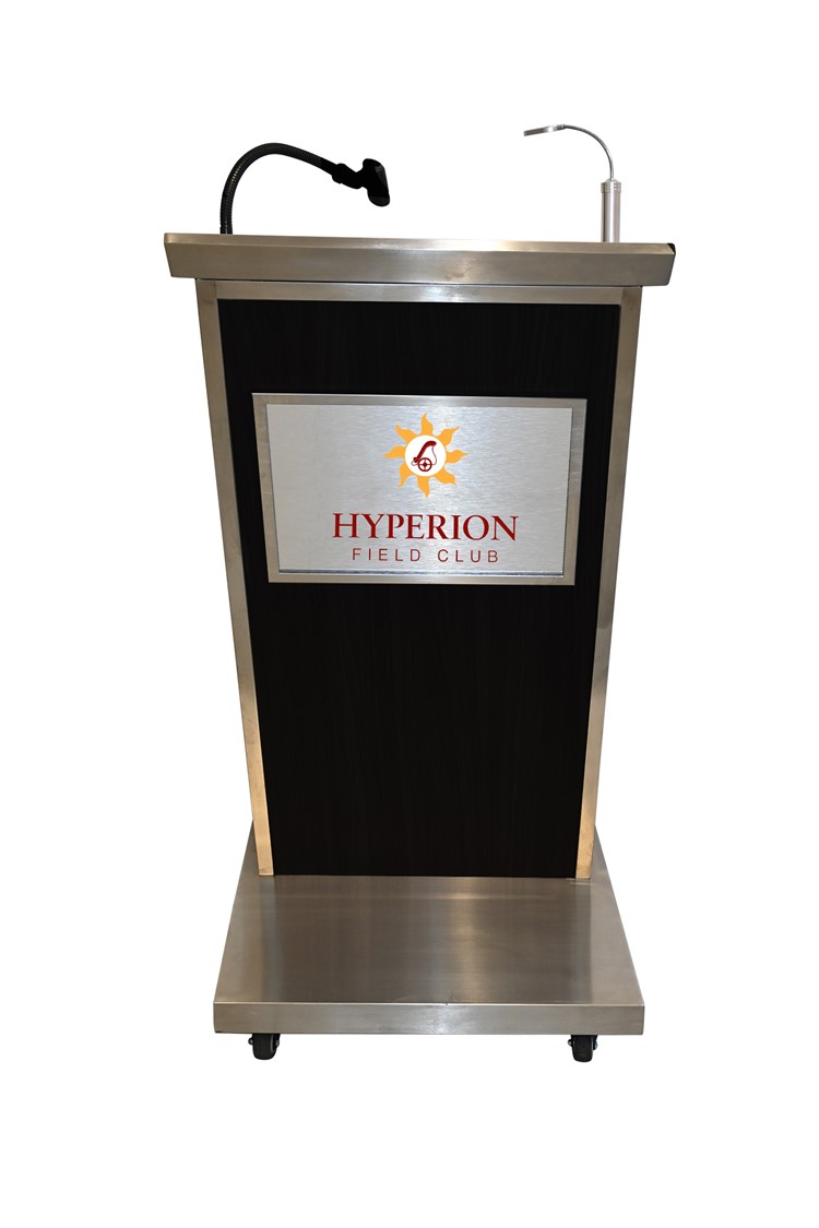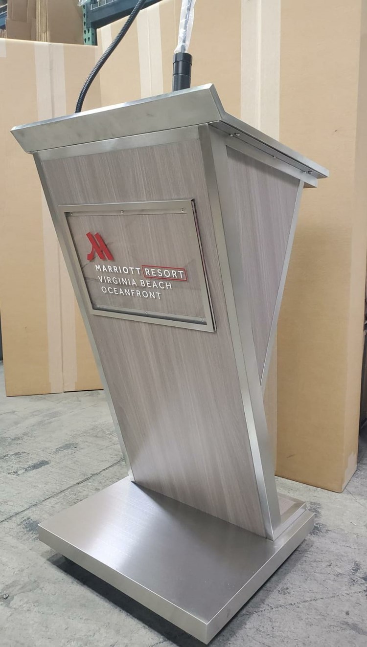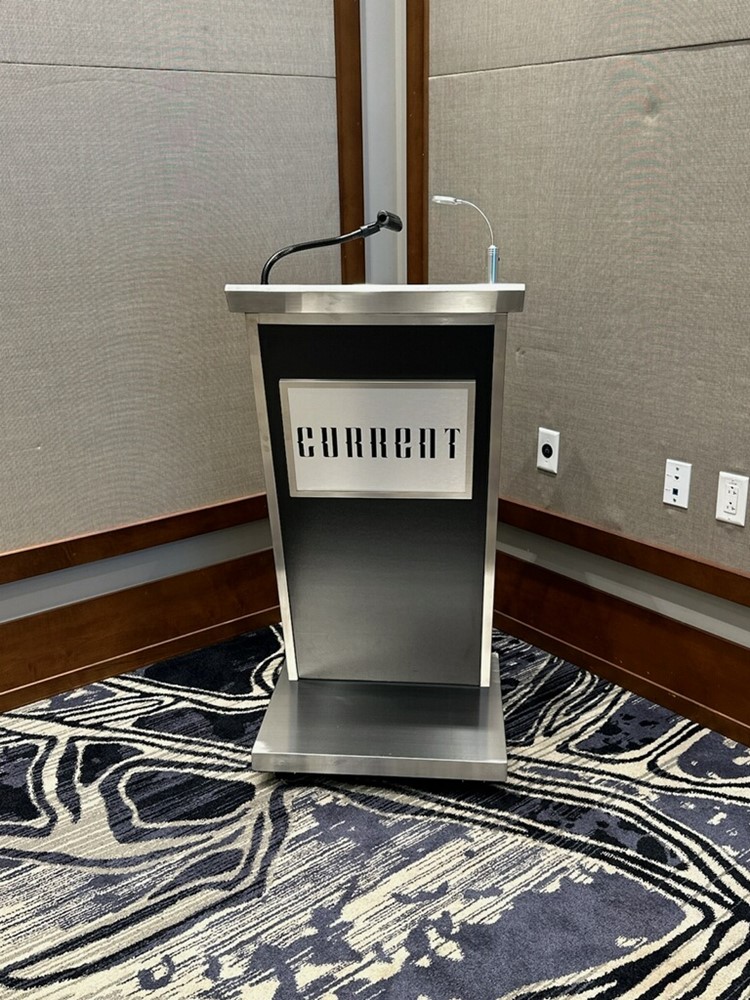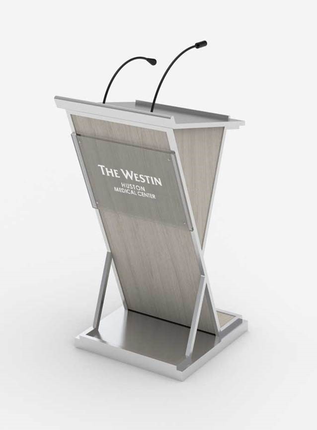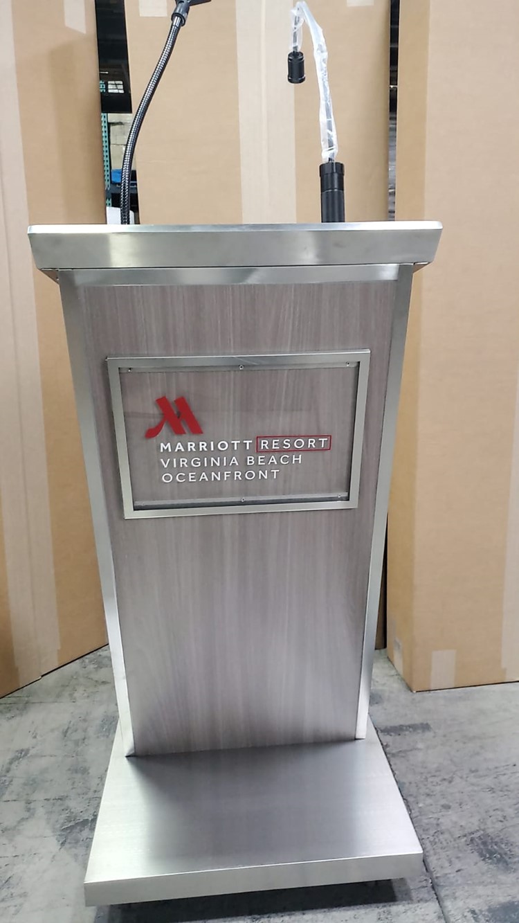 Contemporary Brushed Stainless Steel podium with HPL Grey Grained finish. Small Locking Casters.
