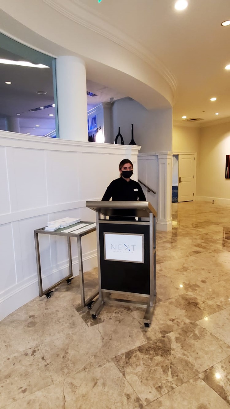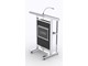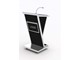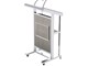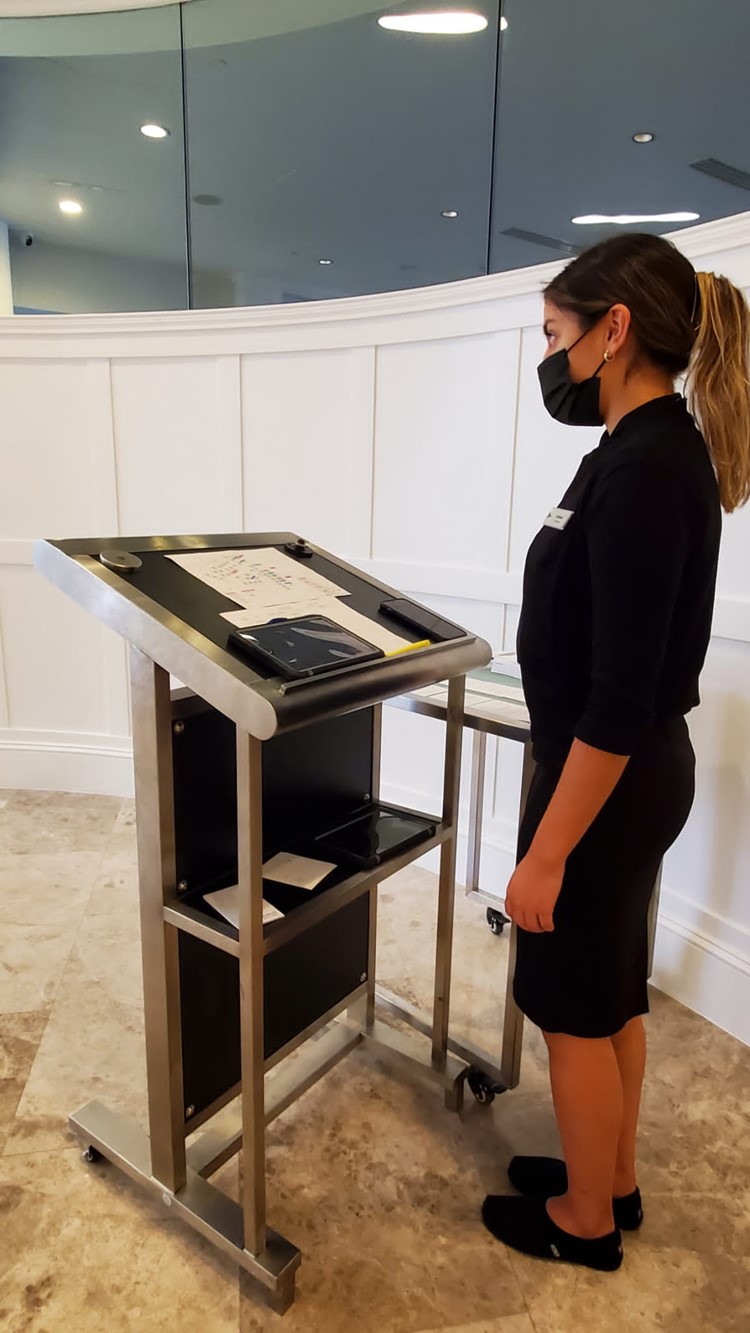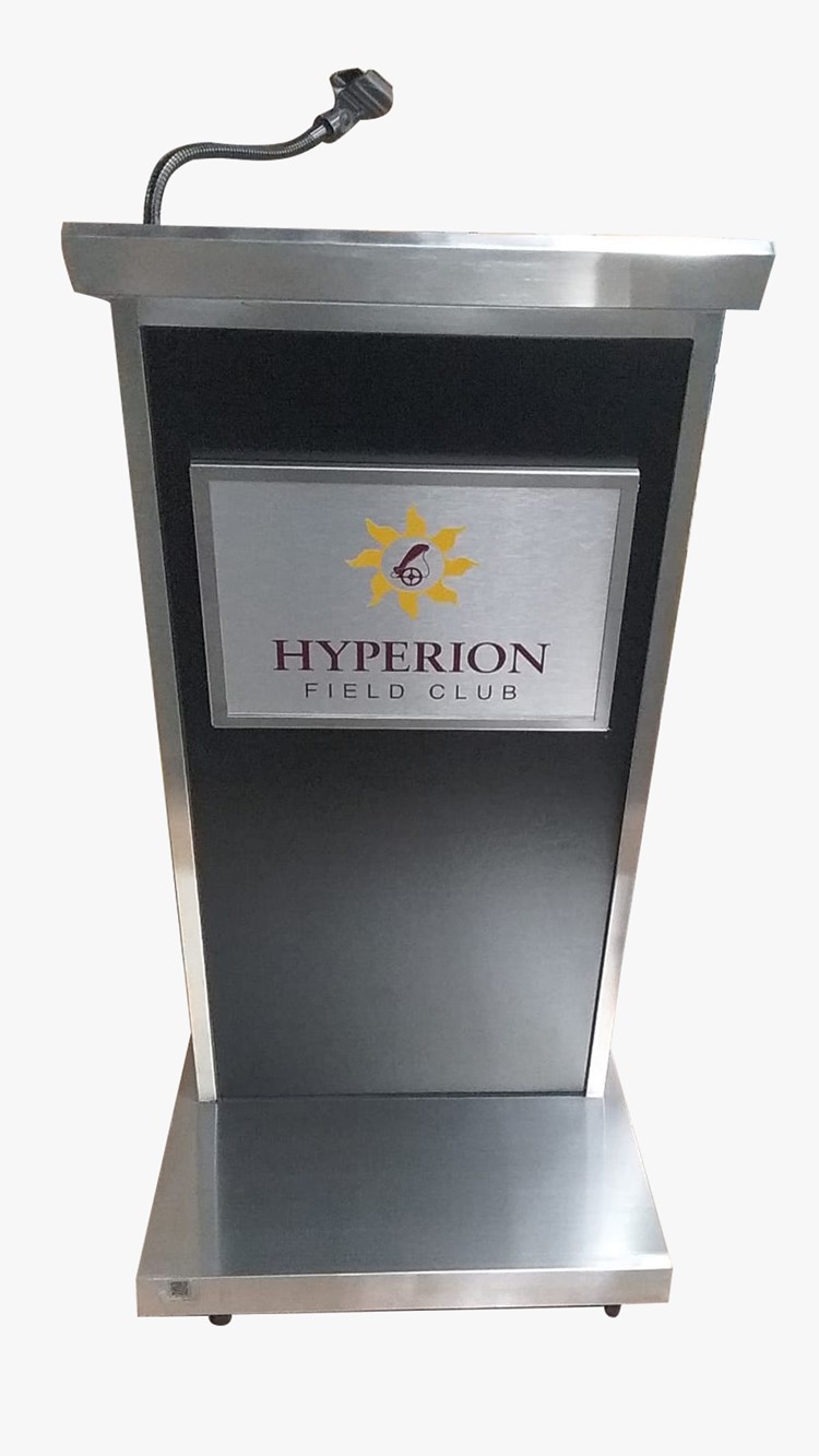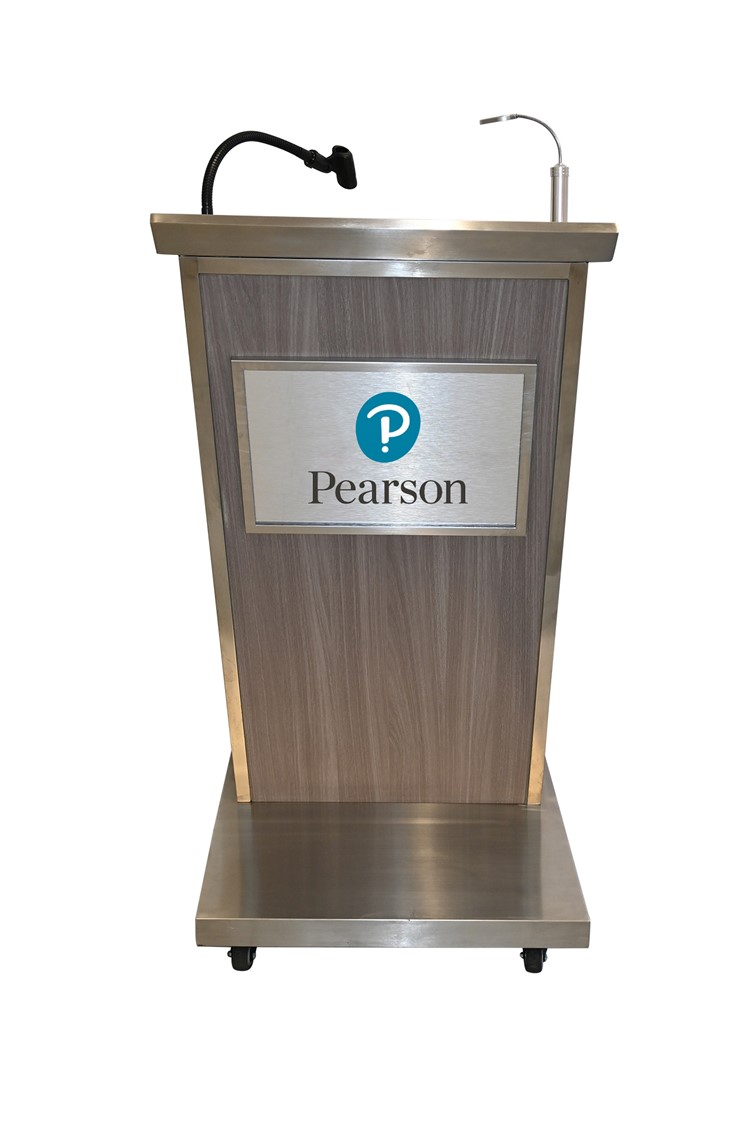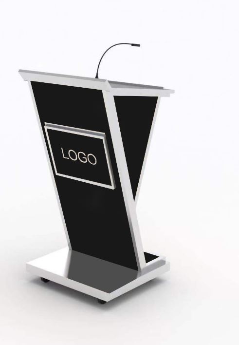 Contemporary Brushed Stainless Steel podium with HPL Grey Grained finish. Small Locking Casters.
