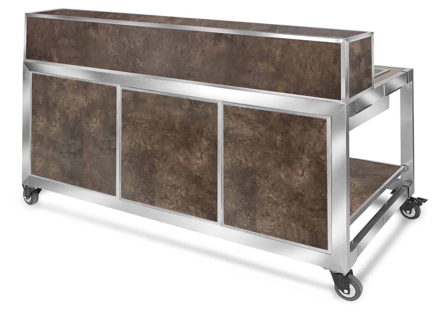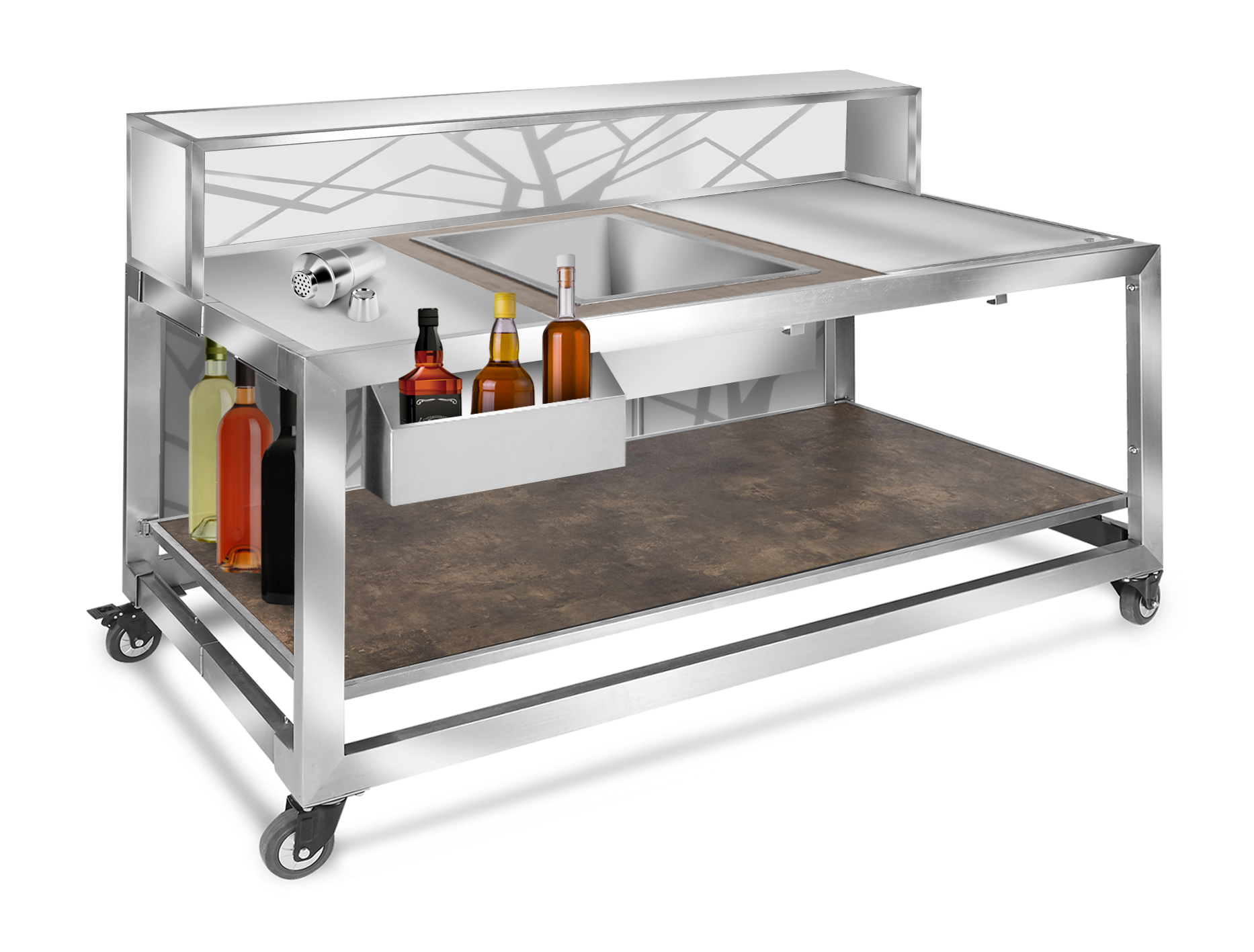 Time for an overhaul. Turn your Hub from buffet to bar in 6 easy steps. Pick your stainless steel frame, chose your bar top, select front/side panels options, drop-in your stainless steel tiles and insulated sink tile, hook up speed rail.