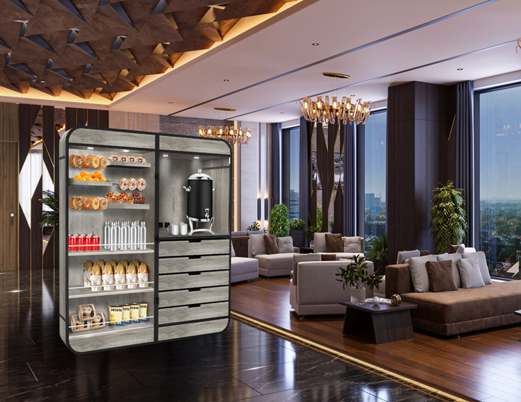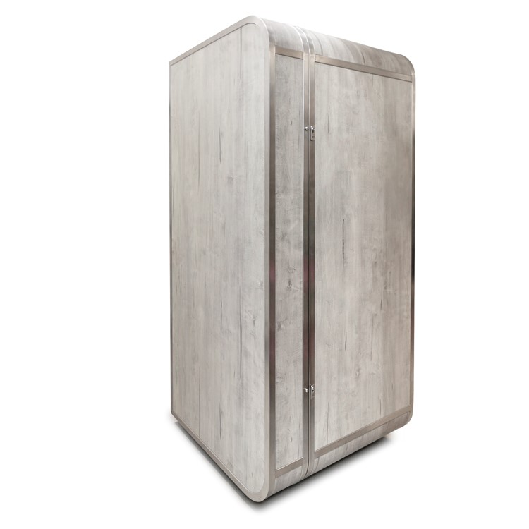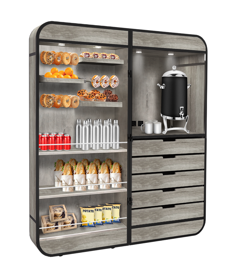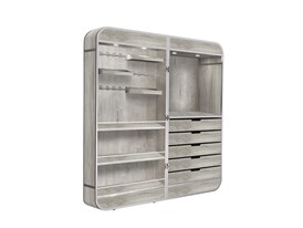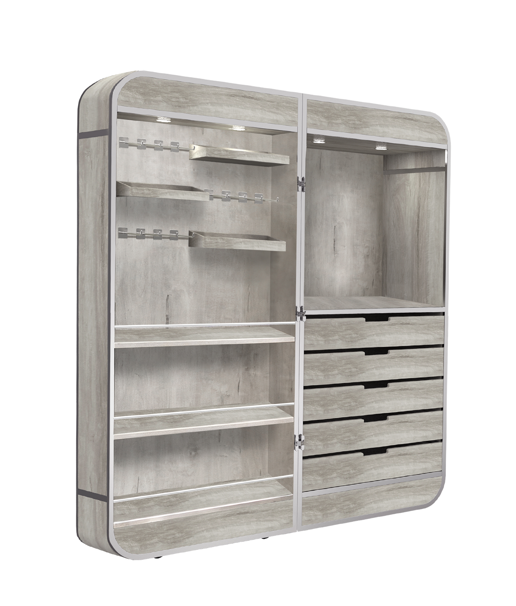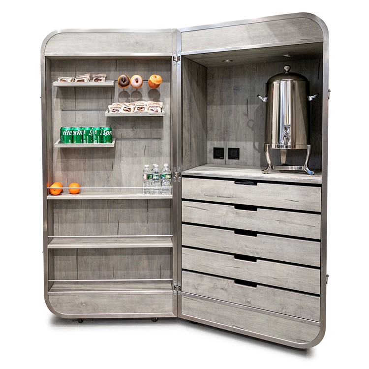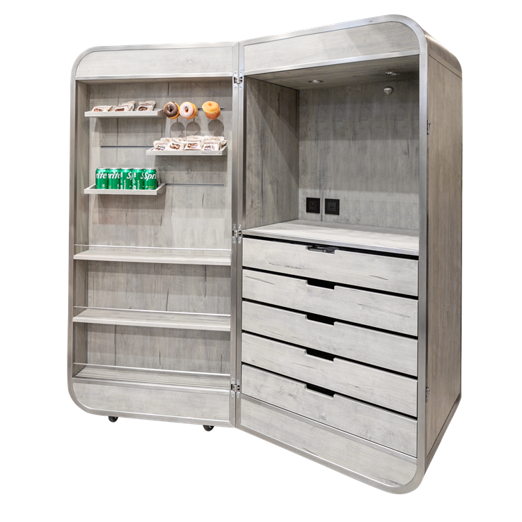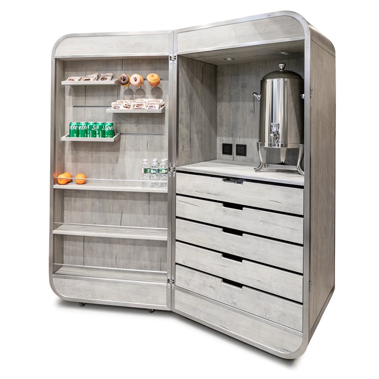 Treasure Trove Multipurpose Station, mobile, (3) shelves with railings, (6) half shelves, (5) 4" deep drawers, (2) interior LED lights, (2) outlets, folds closed for storage, lockable, HPL water-resistant finish, (6) heavy-duty locking casters